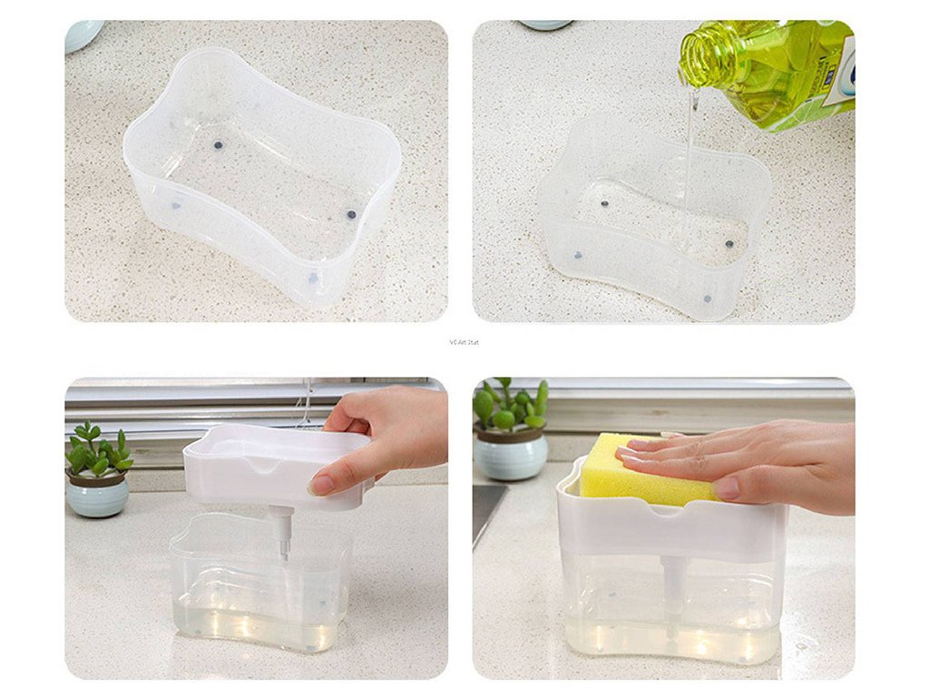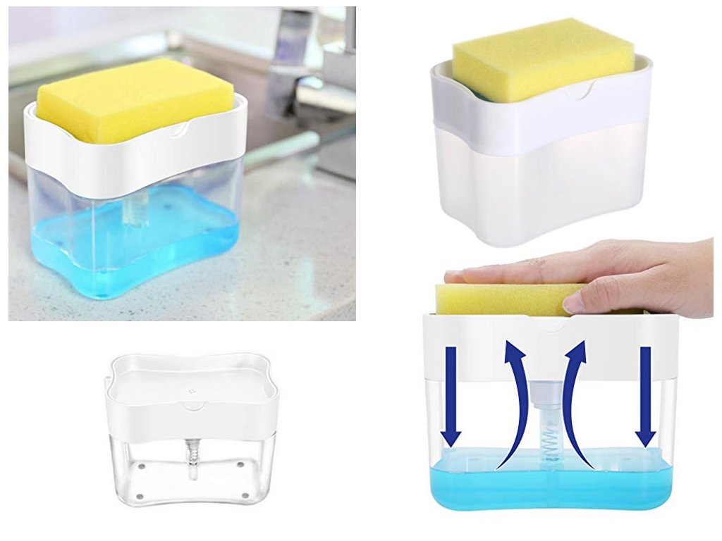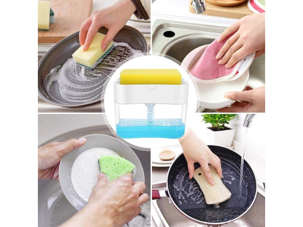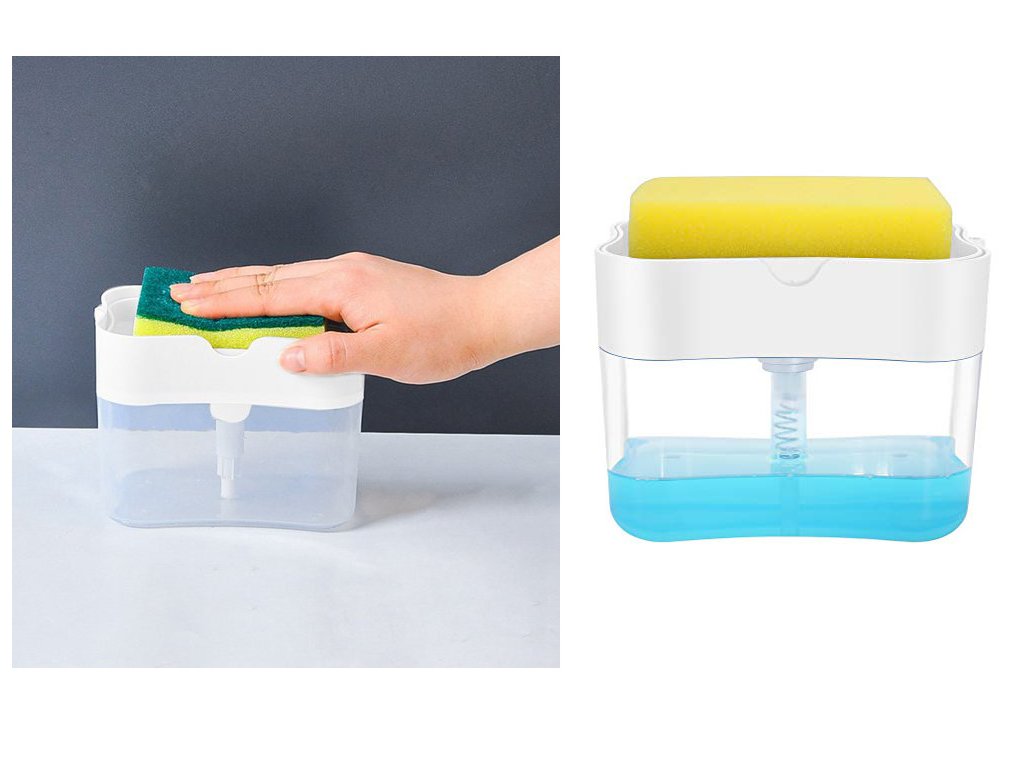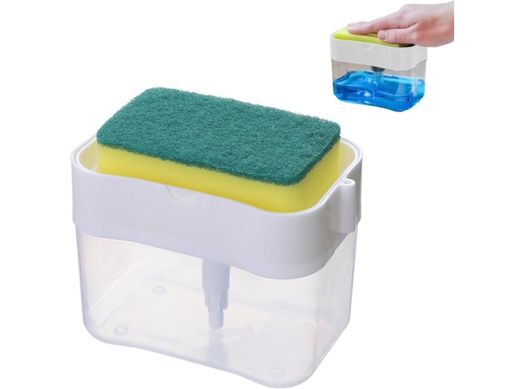 K úžasnému dávkovači saponátu dostanete také kvalitní houbičku na nádobí. Houbičku umístěte na vrchní část dávkovače a tak bude stále připravena k použití. Je to opravdu velmi praktické.