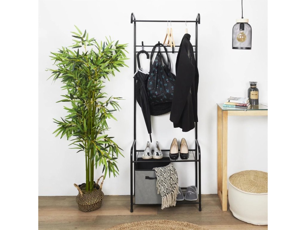 Ať už univerzální multifunkční věšák postavíte do chodby, ložnice nebo kanceláře, pomůže vám maximálně využít každý kousek prostoru. Díky příčné tyči, čtyřem háčkům a dvěma spodním policím si můžete uspořádat oblečení i doplňky na jednom místě.