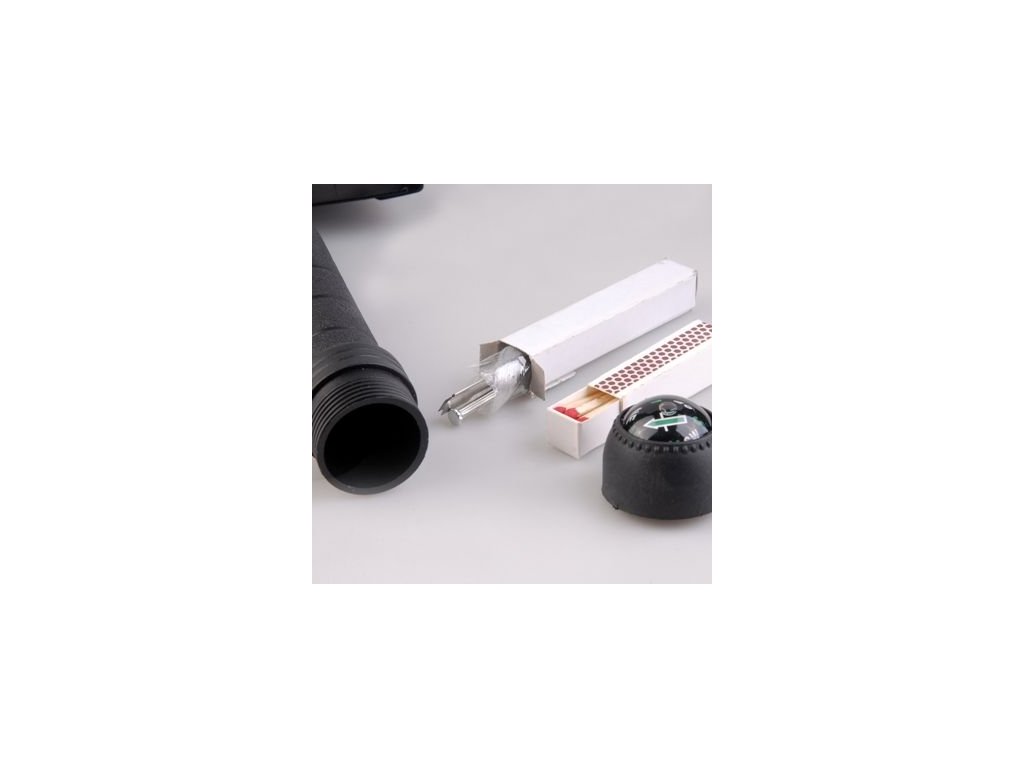 Rukojeť obsahuje hřebíky, vlasec s háčky, zápalky a nůž