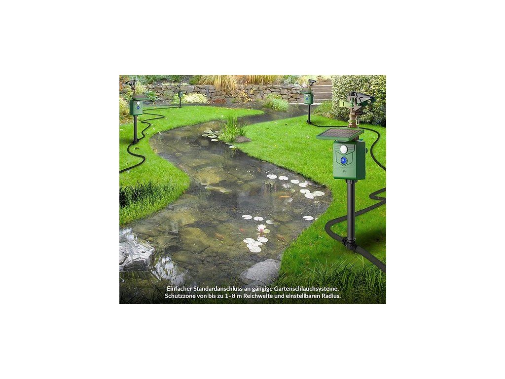 Tento jedinečný plašič využívá nejmodernější technologii pohybového snímače v kombinaci s vysokotlakým vodním proudem, které dokážou bezhlučně a netoxicky ochránit vaši zahradu. Poté, co snímač zaregistruje pohyb, vyšle cílený vodní proud, který zasáhne nežádoucího návštěvníka. Ten rychle opustí chráněný prostor. Takto účinně zabrání vstupu zvířat na chráněné území. Naše zařízení slouží jako nepřetržitý odstrašující prostředek.